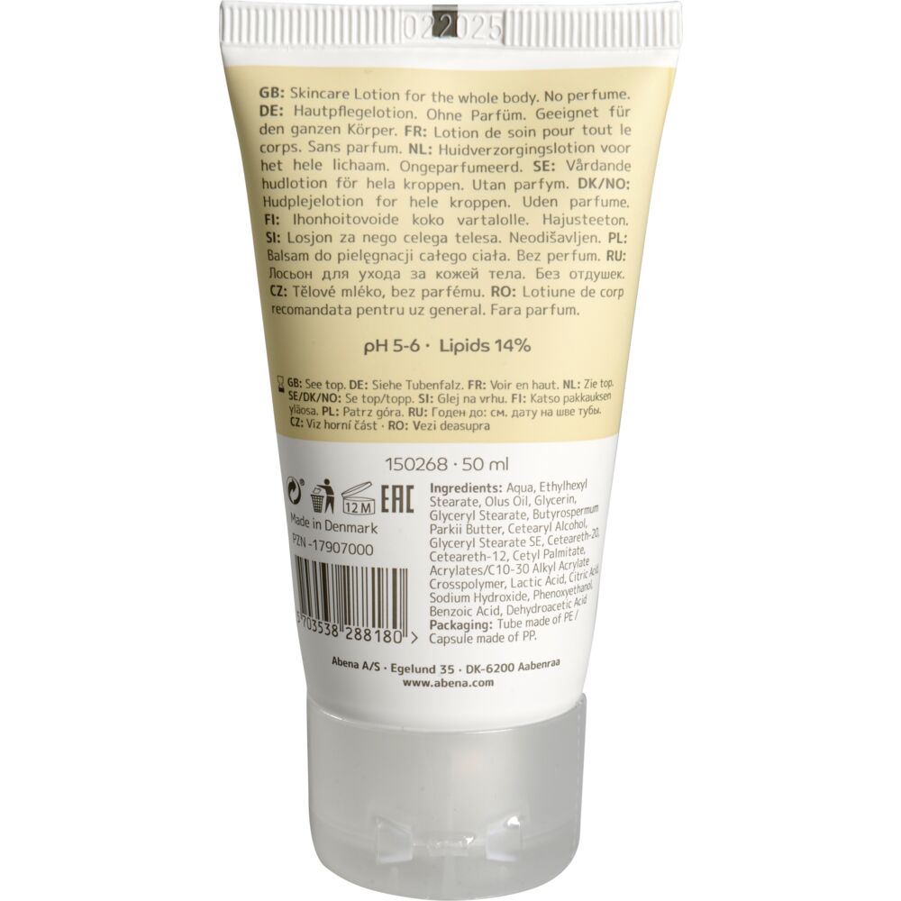 ABENA Hudlotion för normal till torr hud är en lätt återfuktande lotion för daglig användning. Kan användas på händer, kropp och ansikte. Hudlotionen absorberas snabbt av huden och är inte fet. Innehåller återfuktande och mjukgörande ingredienser. Tester har visat att ABENA Hudlotion ger betydande återfuktning i upp till 8 timmar. Krämen innehåller olusolja och sheasmör, som är känt för sina återfuktande och närande egenskaper. Hudlotion utan parfym innehåller antingen 14 % eller 28 % fett. Applicera och smörj in försiktigt. Dosera efter behov. Den här produkten får endast användas utvärtes på kroppen. Undvik kontakt med ögonen.