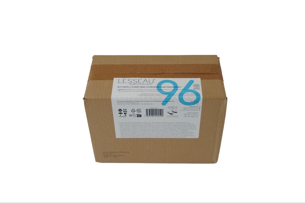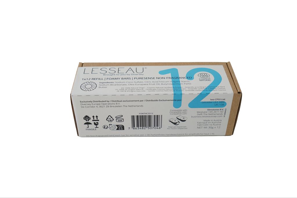 LESSEAU® Foamy Bar PureSense är en fast handtvål som är växtbaserad, doftfri och särskilt utvecklad för att möta den ökande efterfrågan på hållbara hygienlösningar i professionella miljöer. Produkten är tillverkad av ingredienser med 100 % naturligt ursprung, är vegansk och certifierad enligt ECOCERT COSMOS Natural, vilket säkerställer höga krav på både miljö och produktsäkerhet.