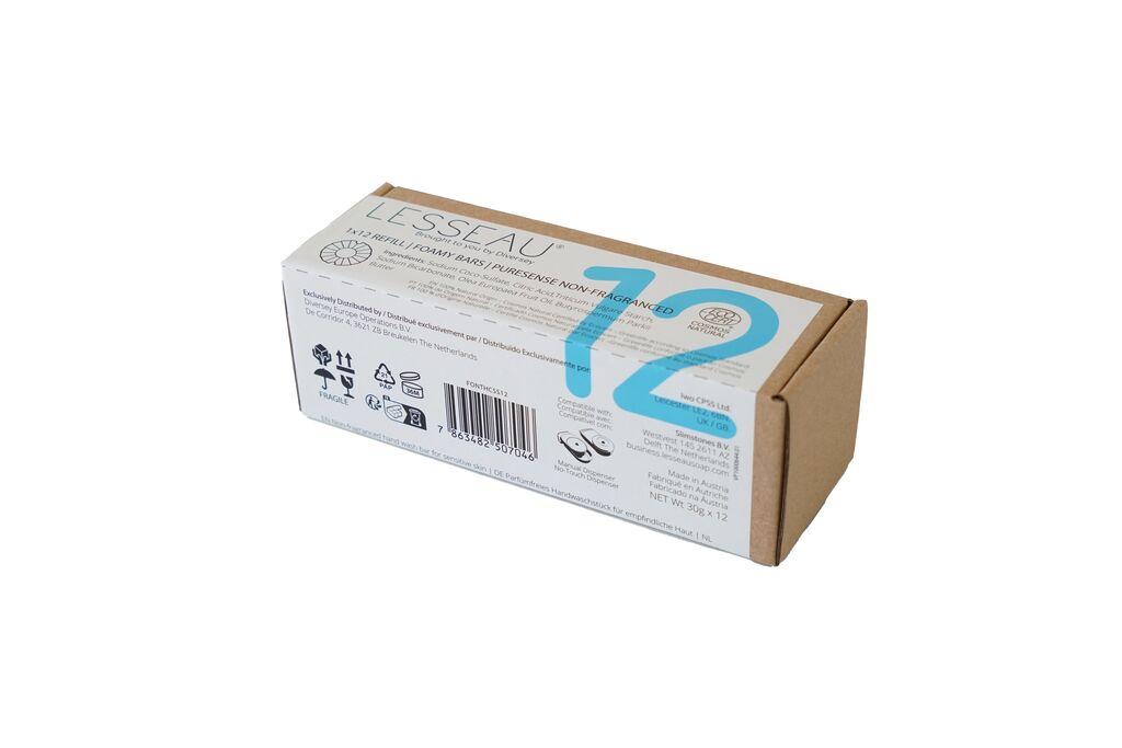 Den parfymfria och dermatologiskt testade formuleringen gör tvålen idealisk för frekvent användning och för personer med känslig hud. Den fasta tvålen används i slutna LESSEAU®-dispensrar, vilket ger kontrollerad dosering, hög hygiennivå och minimerat produktavfall. Samtidigt elimineras behovet av plastförpackningar helt.Funktioner