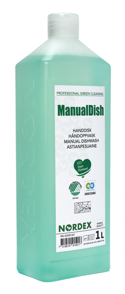 ManualDish är ett koncentrerat handdiskmedel för en daglig cirkulär handdisk med låg dos som löser upp fett effektivt och ger ett glänsande rent resultat på alla diskgods. Angenämt parfymerad.Nordex Green är en serie Cradle to Cradle certifierade rengöringsmedel som har en minimal påverkan på miljön under hela livscykel. Baserade på ingredienser som är biologiskt nedbrytbara och mestadels växtbaserade. Cradle to Cradle står för ett nytt koncept med ett omfattande program för designen av produkter med avseende på användning av material och tillverkning. Programmet utvärderar en produkts säkerhet för människor, miljön och designen för framtida livscykler. Samt fokuserar på att använda säkra material som kan återvinnas som tekniska näringsämnen eller komposteras som biologiska näringsämnen.