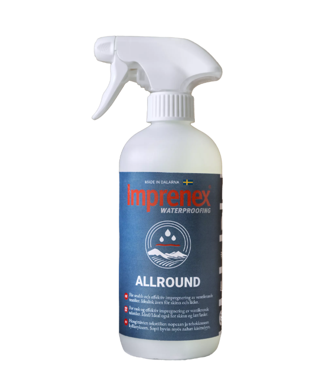 Imprenex Allround är speciellt framtagen för impregnering av funktionsplagg, skor och kängor. Den vattenbaserade impregneringen återger och ökar textilens smuts- och vattenavvisande förmåga utan att påverka membranens andningsförmåga, struktur eller färg.