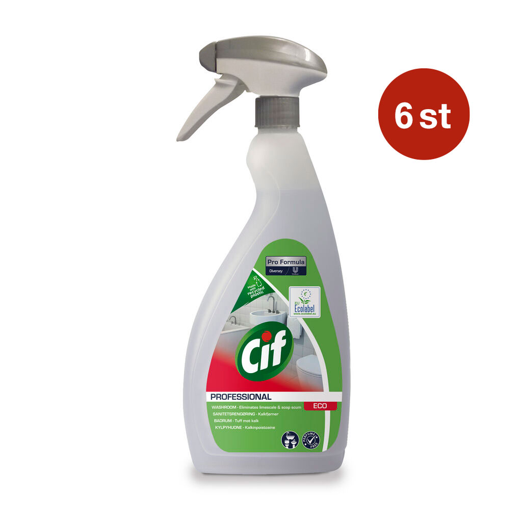 Cif Professional Eco Washroom rengöringsmedel är parfymfri och ger ett gnistrande resultat genom att ta bort kalk, smuts och tvålrester på alla ytor i toalettutrymmet. Idealisk för badkar, duschar, tvättställ, WC, krom & rostfritt stål, plast & keramik. Ej lämplig för marmor och andra syrakänsliga ytor. Parfym- och färgämnesfri.