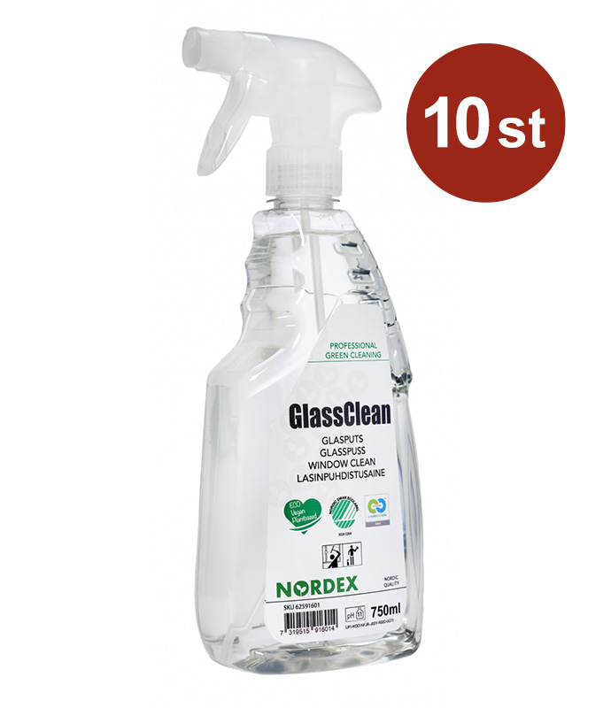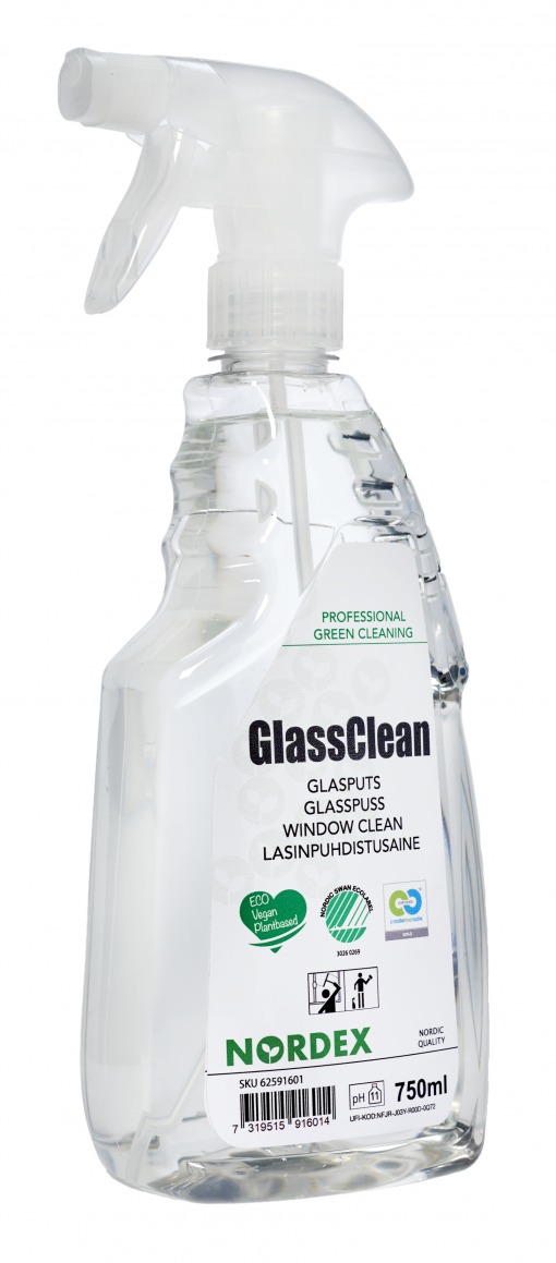 GlassClean är ett effektivt bruksfärdigt rengöringsmedel i spray för en daglig cirkulär putsning av glas, speglar och andra släta ytor. Lämnar inga rester. Oparfymerad.Nordex Green är en serie Cradle to Cradle certifierade rengöringsmedel som har en minimal påverkan på miljön under hela livscykel. Baserade på ingredienser som är biologiskt nedbrytbara och mestadels växtbaserade. Cradle to Cradle står för ett nytt koncept med ett omfattande program för designen av produkter med avseende på användning av material och tillverkning. Programmet utvärderar en produkts säkerhet för människor, miljön och designen för framtida livscykler. Samt fokuserar på att använda säkra material som kan återvinnas som tekniska näringsämnen eller komposteras som biologiska näringsämnen.