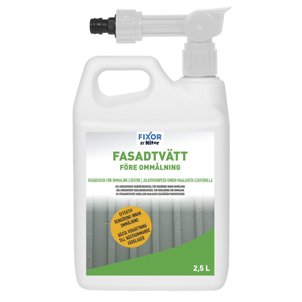 För rengöring av bl. a. fasader utomhus före ommålning samt grovrengöring. Koncentrat. Späd 1:20-1:50. Med blekeffekt.