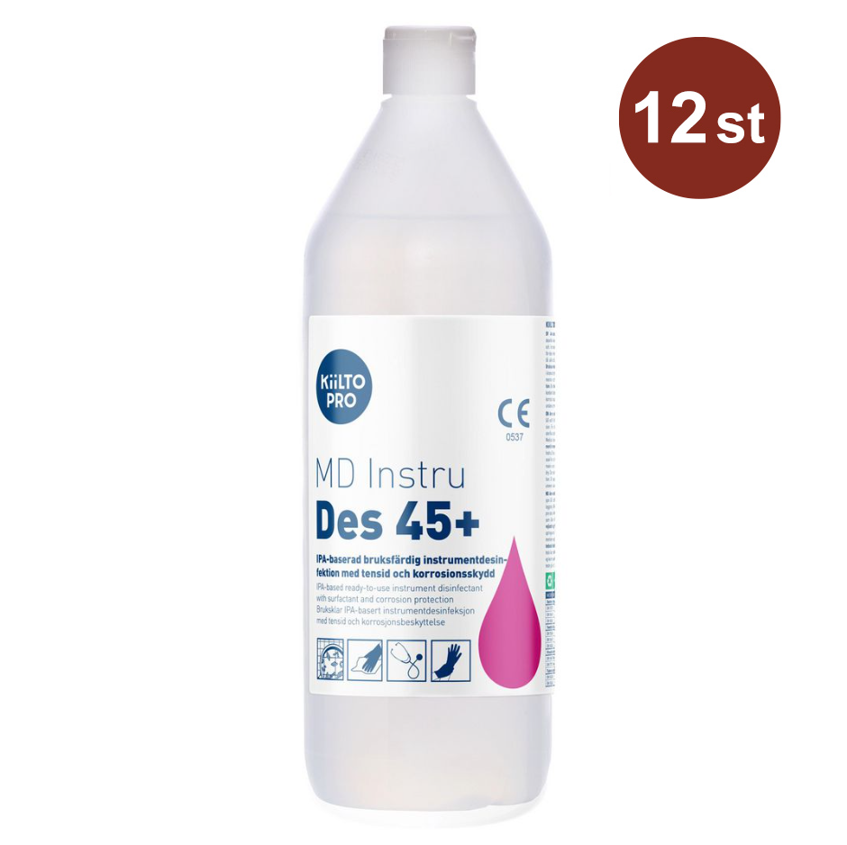 Medicinteknisk produkt för professionell användning inom hälso- och sjukvården samt tandvården. KiiltoPro MD Instru Des 45+ innehåller 45 vol% isopropylalkohol, tensider för rengöring samt korrosionsskydd för att motverka rost. Produkten är avsedd för desinfektion av medicinteknisk utrustning och rekommenderas inte för användning inom restaurangsektorn.