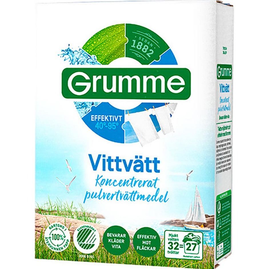 Grumme Vittvätt är ett koncentrerat pulvertvättmedel utan onödiga tillsatser, utvecklat för att bevara kläder vita och effektivt avlägsna fläckar. Produkten ger ett rent resultat och räcker upp till cirka 32 tvättar. Miljöanpassad och märkt med Svanen samt förpackad i FSC-certifierad kartong.