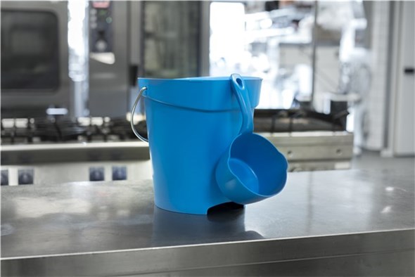 Perfekt för att flytta ingredienser, vätska osv. i områden med livsmedelsproduktion. Skopans insida har måttangivelser.