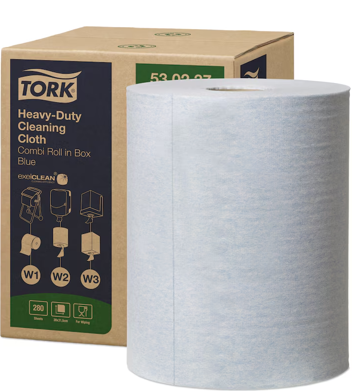 Tork Rengöringsduk Kraftig Premium Blå är en mångsidig och slitstark rengöringsduk som är designad för professionell användning i både vård och industrimiljöer. Duken har hög absorptionsförmåga, är tjock och hållbar och klarar kraftig gnuggning utan att trasas sönder. Den skyddar händerna mot metallspån, hög värme och tuffa arbetsförhållanden samtidigt som den effektivt avlägsnar olja, fett, smörjmedel och envis smuts. Produkten är kompatibel med de flesta lösningsmedel och kan användas både torr och med rengöringsmedel. Den passar i Tork golv- eller väggställ samt i Tork Dispenser Maxi Centrummatad och Tork Dispenser Rulle i box, som alla är utformade för enkel användning med en hand.