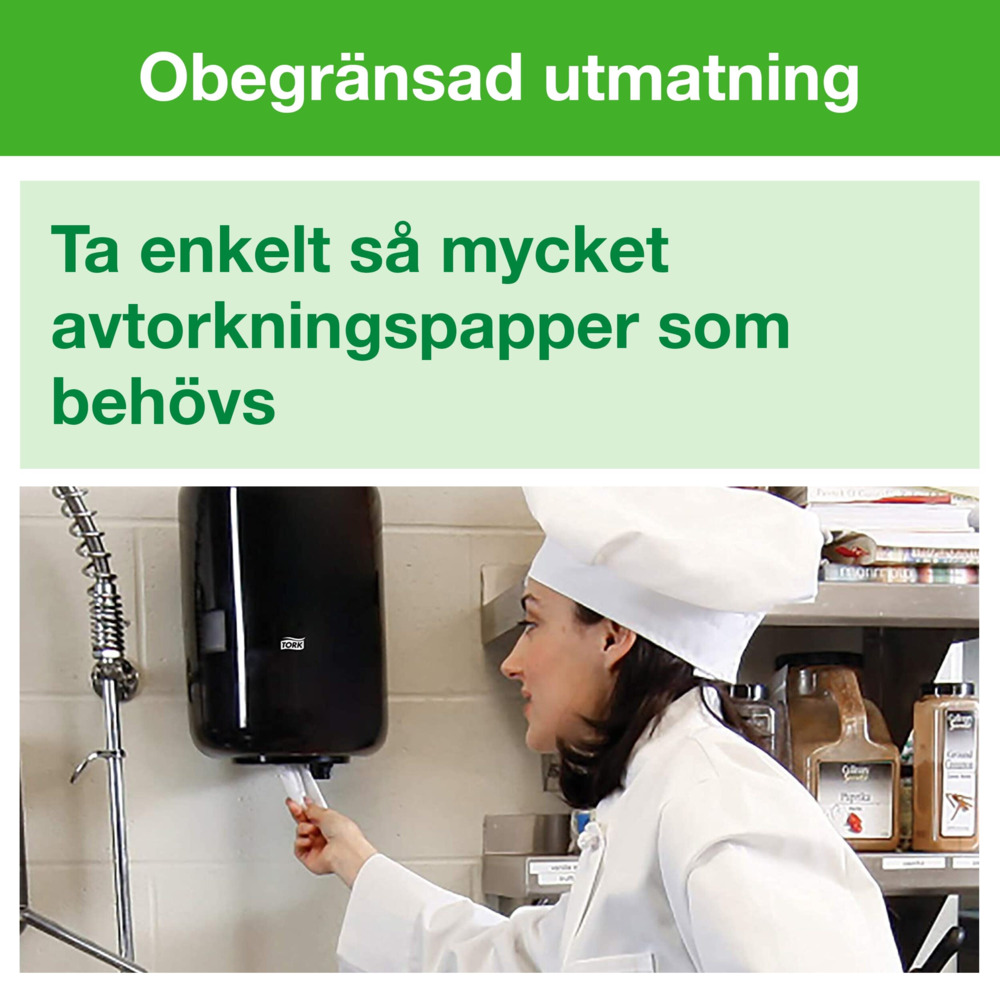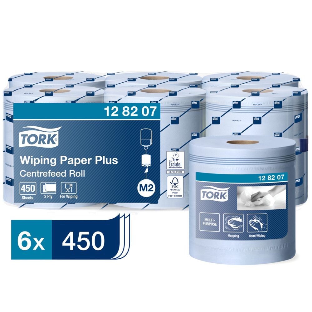 Tork Plus Centrummatad M2 2-Lags Blå är ett tåligt och absorberande avtorkningspapper för spill och handavtorkning i kök, industrilokaler och andra miljöer med högt tempo. Papperet är centrummatad för enkel enhandsutmatning med hög kapacitet och obegränsad utmatning, vilket underlättar för personalen. Tork slutindikator hjälper till att planera byten av rullar och minskar avbrott i arbetet. Produktionen sker med minskat fossilt CO2-utsläpp genom användning av biogas och certifierad förnybar el.