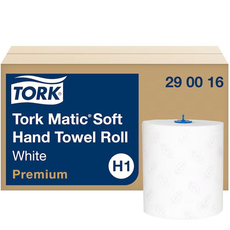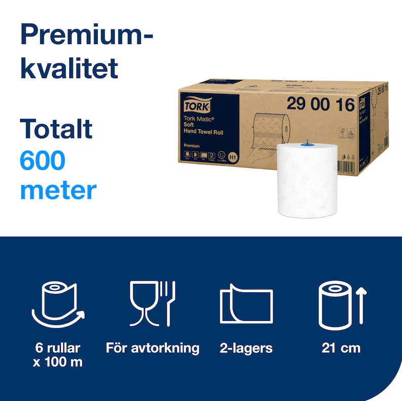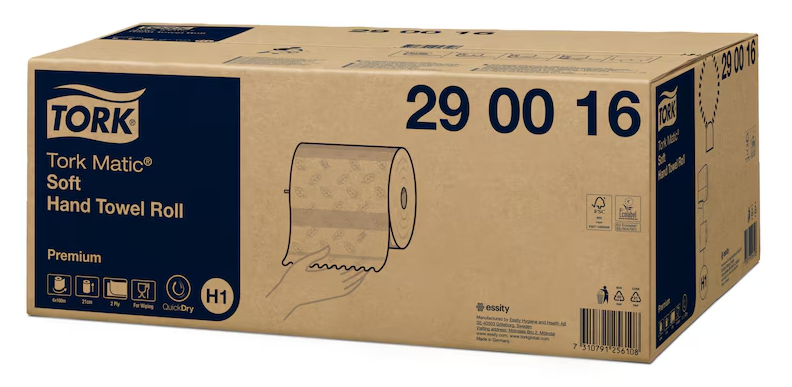 Tork Matic® Handduk på rulle passar utmärkt i högklassiga toalettutrymmen. De är mjuka och mönsterpräglade med ett snyggt blått löv. Handdukarna torkar händerna snabbt och noggrant med hjälp av funktionen QuickDry™. Rullarna passar i Tork Matic® Dispenser Handduk på rulle som har utvecklats för enkelt underhåll i välbesökta toalettutrymmen. Dispensern sparar tid och reglerar åtgången genom att mata ut ett ark i taget.