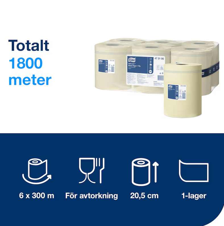 Tork Reflex® Basic 1-lagerspapper passar perfekt för enkla avtorkningsuppgifter, för handavtorkning och när priset är en viktig faktor. Detta papper kan användas i Tork Reflex® centrummatade dispenser, som matar ut ett ark i taget och passar ditt teams arbetsflöde, minskar förbrukningen och minimerar risken för korskontaminering.