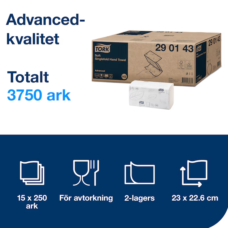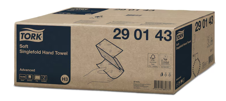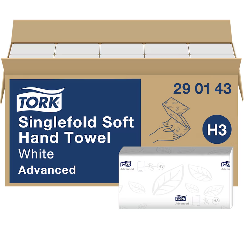 Tillgodose handavtorkningsbehoven med Tork Singlefold Handduk i Advanced-kvalitet som har rätt kvalitet för miljöer där kostnad och prestanda är lika viktiga faktorer. Denna handduk passar Tork Dispenser Singlefold Handduk för krävande miljöer. Med sin tillförlitliga utmatning av ett ark i taget främjar den god hygien och hjälper till att kontrollera handdukskonsumtionen.