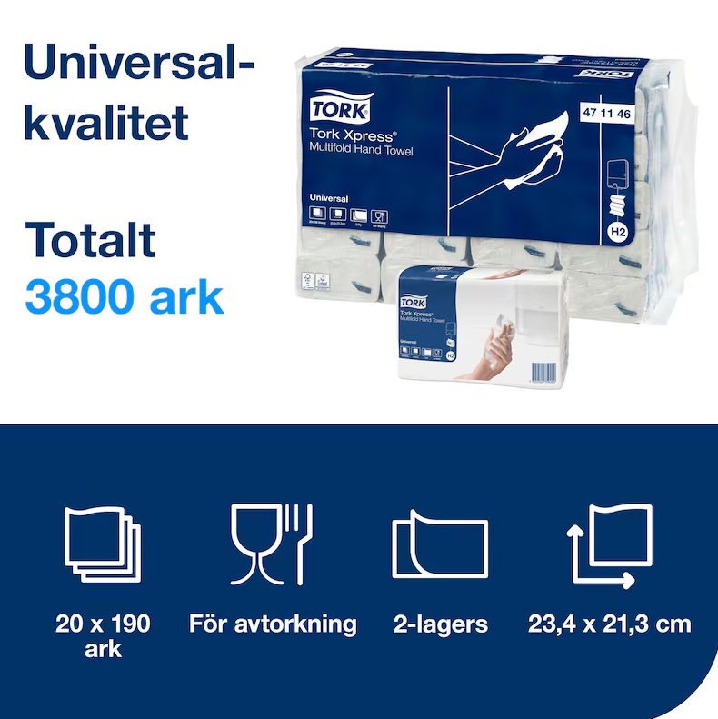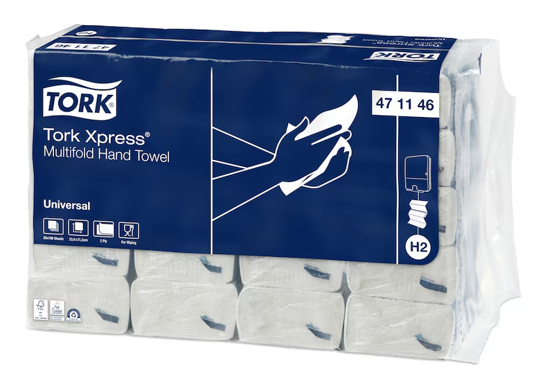 Uppfyll behovet av handavtorkning med Tork Xpress® Mjuk Multifold Handduk i Universal kvalitet som ger ett bra värde för pengarna. Dessa handdukar passar i Tork Xpress® Dispenser Multifold Handduk för toalettutrymmen med medelhög besöksfrekvens. Dispensern får plats i små utrymmen och erbjuder dina gäster både komfort och hygien.