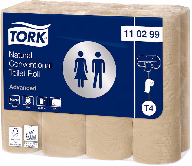 Ge gästerna samma komfort som hemma med extra långt toalettpapper i Advanced-kvalitet från Tork. Det här är ett kostnadseffektivt och funktionellt toalettpapper – perfekt för toalettutrymmen med låg besöksfrekvens. Pappret tillverkas av 100 % återvunna fibrer.