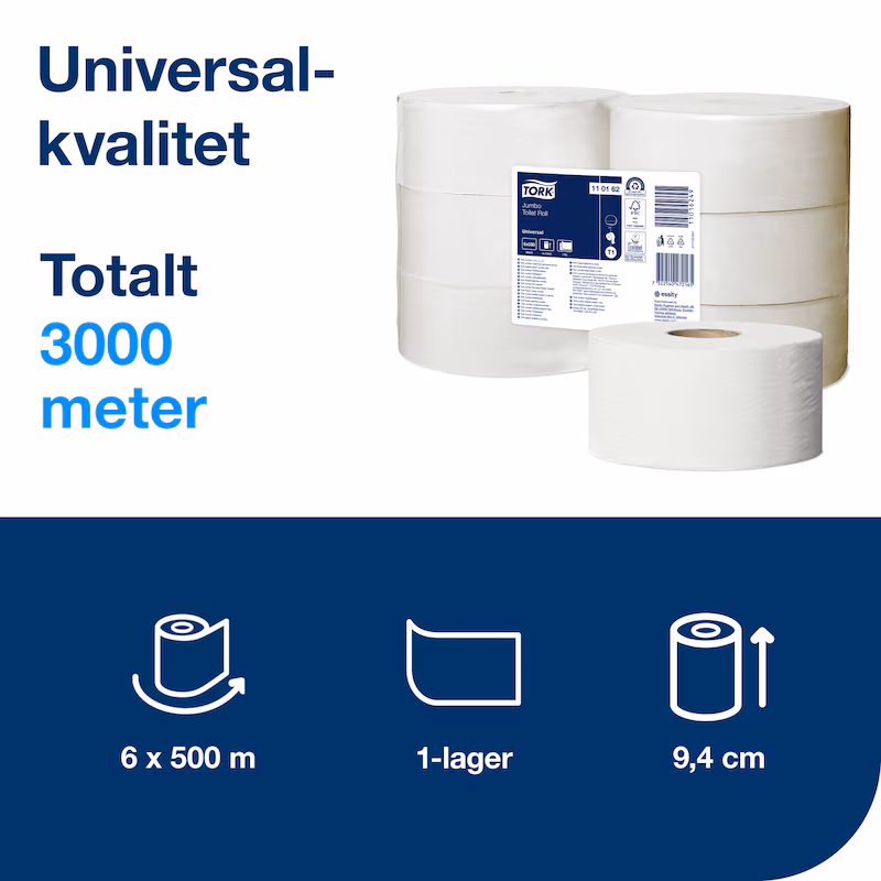 ● Systemet Tork Jumbo innebär effektivt utnyttjande av tiden och minskade kostnader och erbjuder mycket mer toalettpapper än standardrullar. Tork Universal Jumbo toalettpapper med 1 lager tillgodoser de grundläggande behoven för ett toalettutrymme, erbjuder bra värde för pengarna och är lämpligt för platser med hög besöksfrekvens.