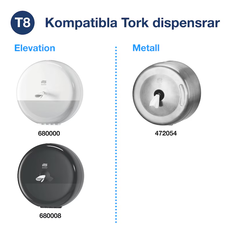 ● Systemet Tork SmartOne® Toalettpapper är unikt i och med att det matar ut ett hygieniskt ark i taget. Det bidrar till att minska förbrukningen med upp till 40% jämfört med traditionella dispensrar för jumbo toalettpapper och innebär fler besök per rulle. Högkapacitetsrullarna Tork SmartOne® passar i miljöer med hög besöksfrekvens.
