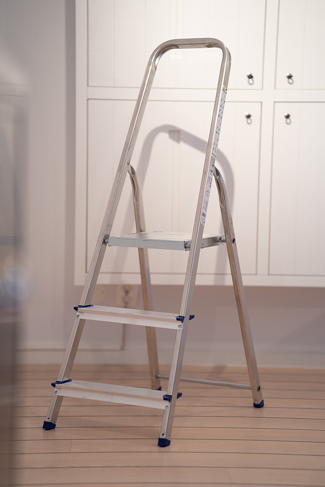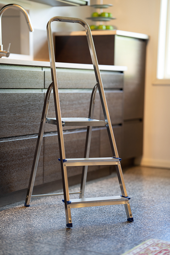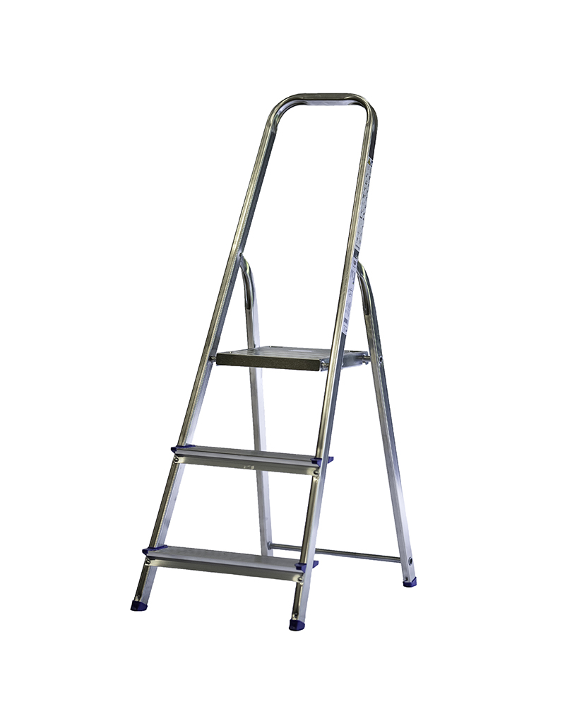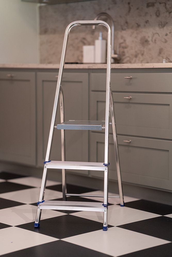 Praktisk trappstege tillverkad i aluminium med plattform i plåt, vilket gör att stegen är lätt och smidig att använda.